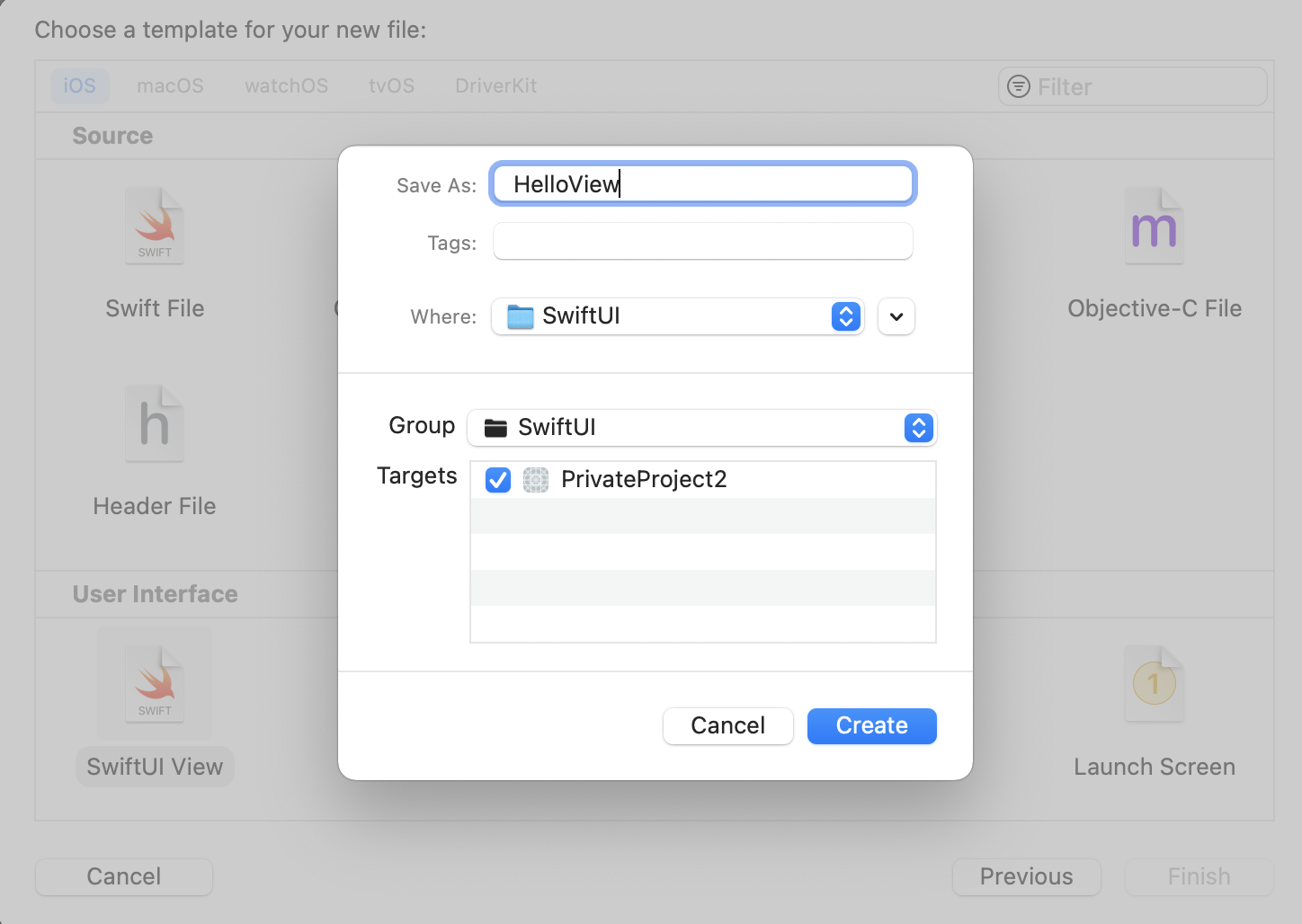 이제 표현할 SwiftUI 파일을 생성해 줍니다. 이번 글에서는 가장 기본인 Hello World 만 사용하겠습니다.
