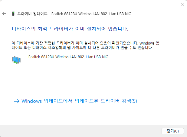 - 장치 관리자에서 [Realtek 8812BU Wireless LAN 802.11ac USB NIC] 의 우클릭 [드라이버 업데이트] 클릭