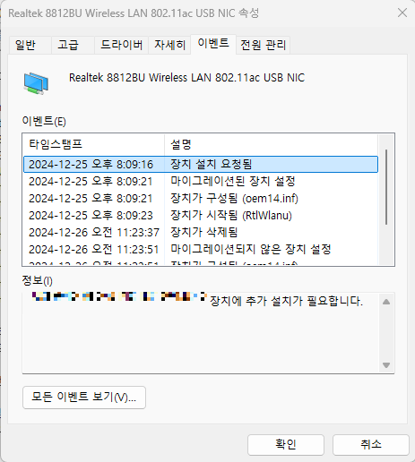 - 장치 관리자에서 [Realtek 8812BU Wireless LAN 802.11ac USB NIC] 의 우클릭 [디바이스 제거] 클릭