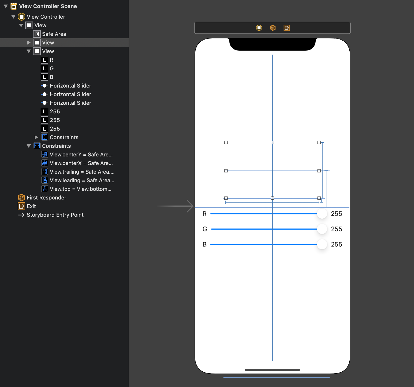 Slider의 값을 설정해줍니다. 이번에 만들 어플은 컬러의 RGB 값을 활용하는 것이기 때문에 최소치를 0, 최대치를 255로 지정해 줍니다.